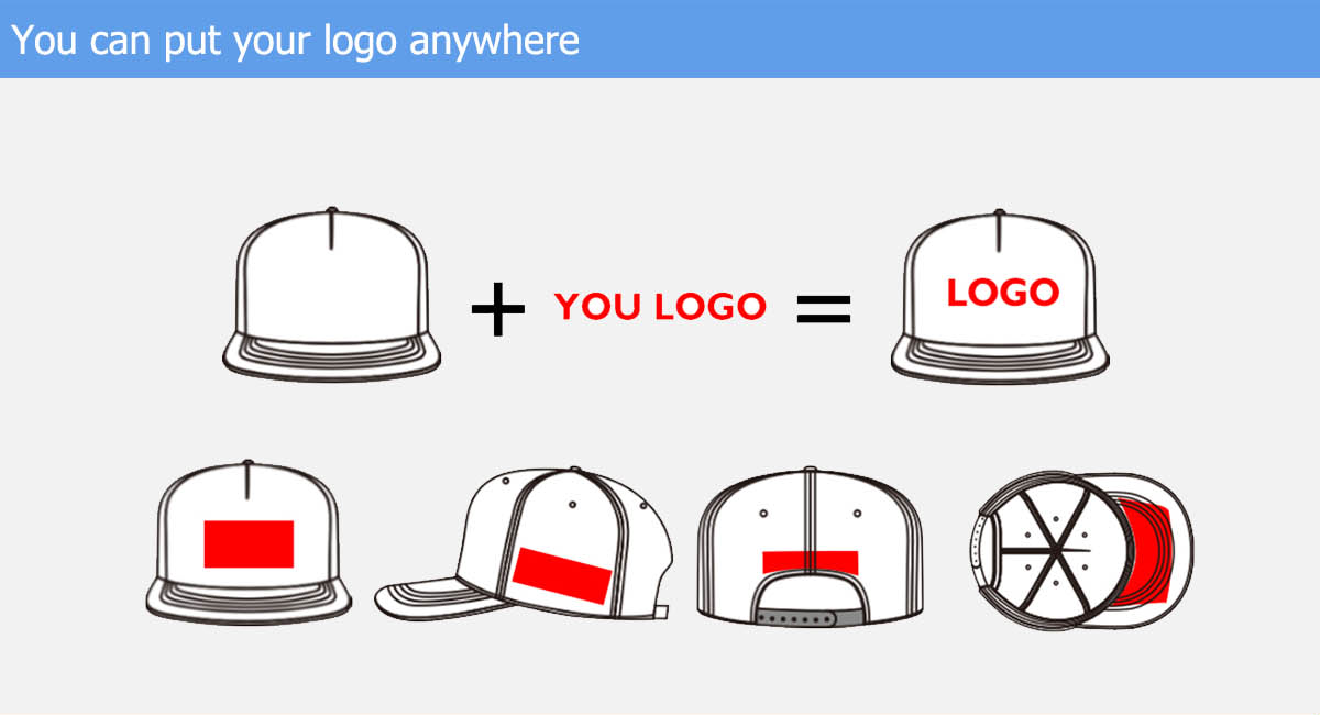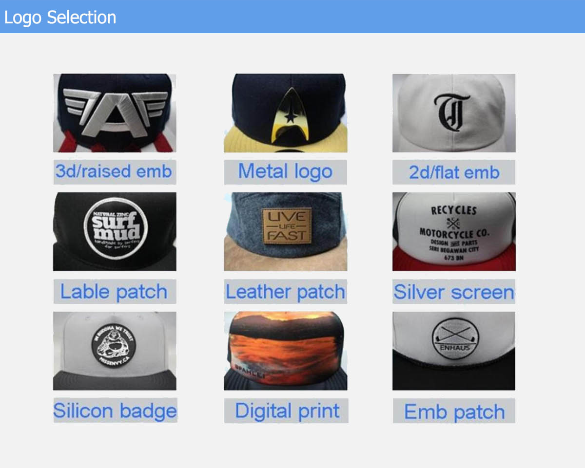 Logo Design custom Flat & 3D embroidery, silkscreen, heat press printing, laser cut, woven patch, metal patch, rubber patch, heat-melting rhinestone, double printing, appliqué, inner mesh layer, inner lining etc.